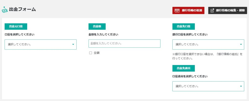 登録が完了している場合は、「出金元口座」、「出金額」、「出金先口座」、「出金先通貨」を入力します。