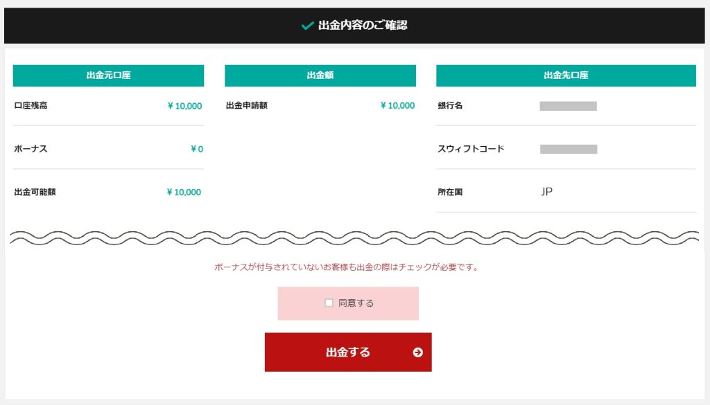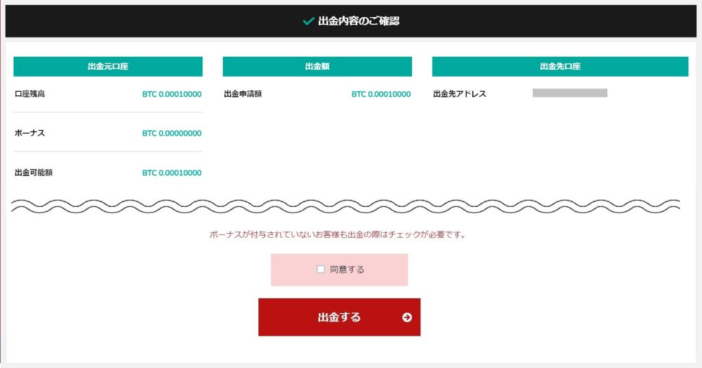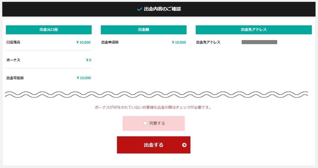 画面を下にスクロールし、出金内容を確認後、問題がなければ「同意する」にチェックを入れ「出金する」をクリックします。