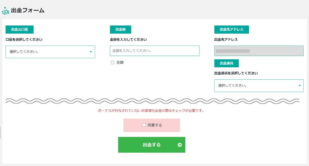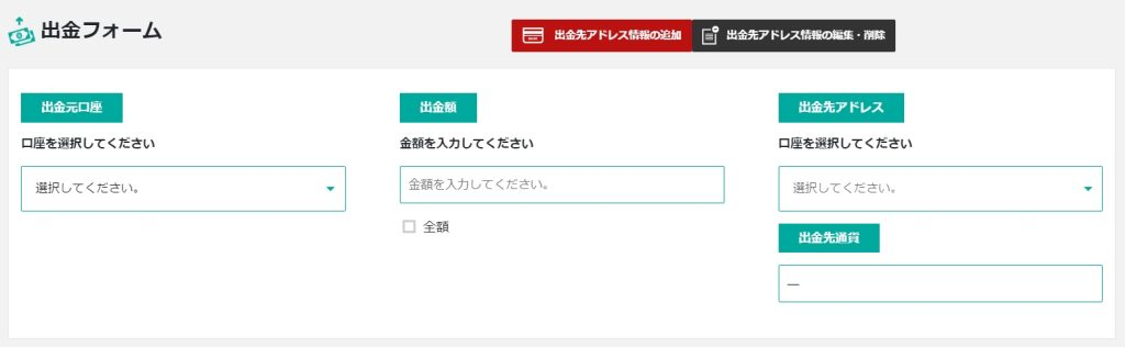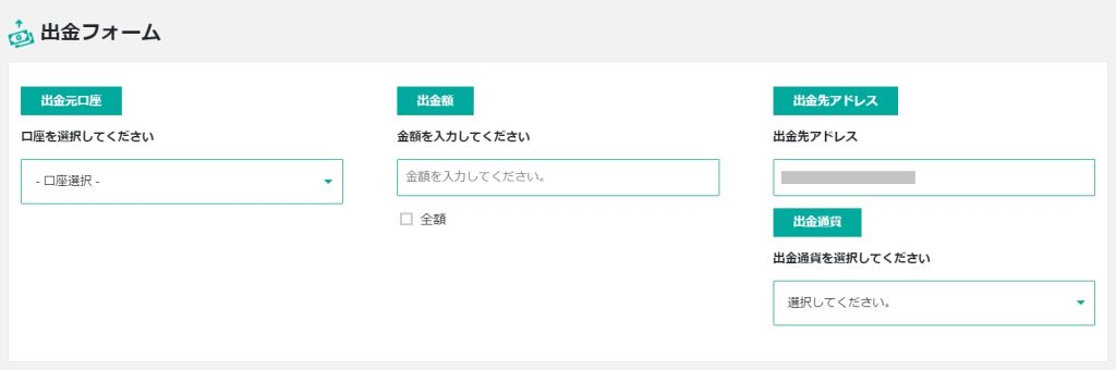 出金フォームに「出金元口座」、「出金額」、「出金先アドレス」、「出金通貨」を入力します。