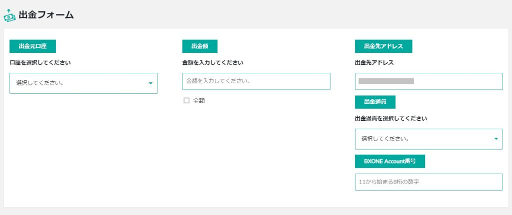 出金フォームに「出金元口座」、「出金額」、「出金先アドレス」、「出金通貨」、「BXONE Account番号」を入力します。