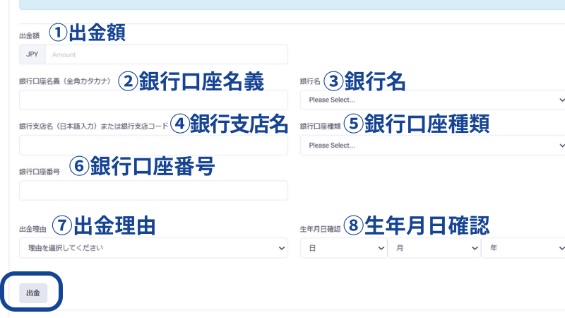 出金したい予定の金額を入力し金額を終えたら、振り込みたい銀行口座の情報を入力してください。入力を終えたら、忘れずに「出金ボタン」をクリックしてください。