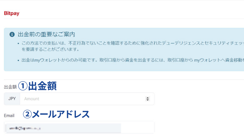 出金したい金額とメールアドレス、出金のための基本情報を入力してください。入力を終えたら、忘れずに出金ボタンを押してください。