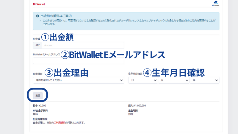 出金したい金額とBitWalletの登録アドレス、口座の基本情報を入力してください。入力を終えたら、忘れずに出金ボタンを押してください。