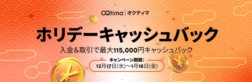 OQtima(オクティマ)では、入金額と取引量の条件達成で最大11万円をキャッシュバックキャンペーンを実施中です。